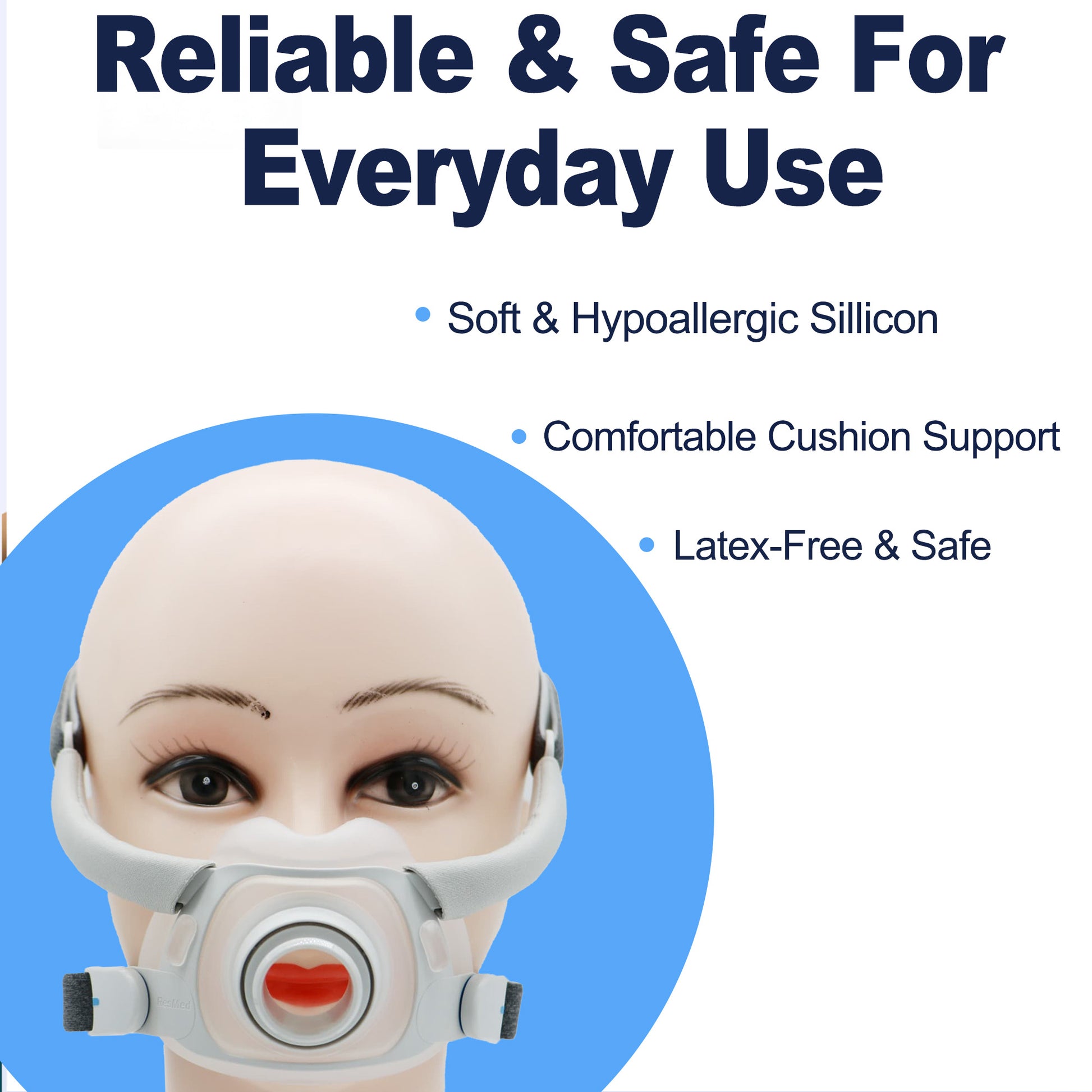 - ADJUSTABLE HEADGEAR STRAP – Flexible fabric with multiple Velcro adjustment points for a stable fit.