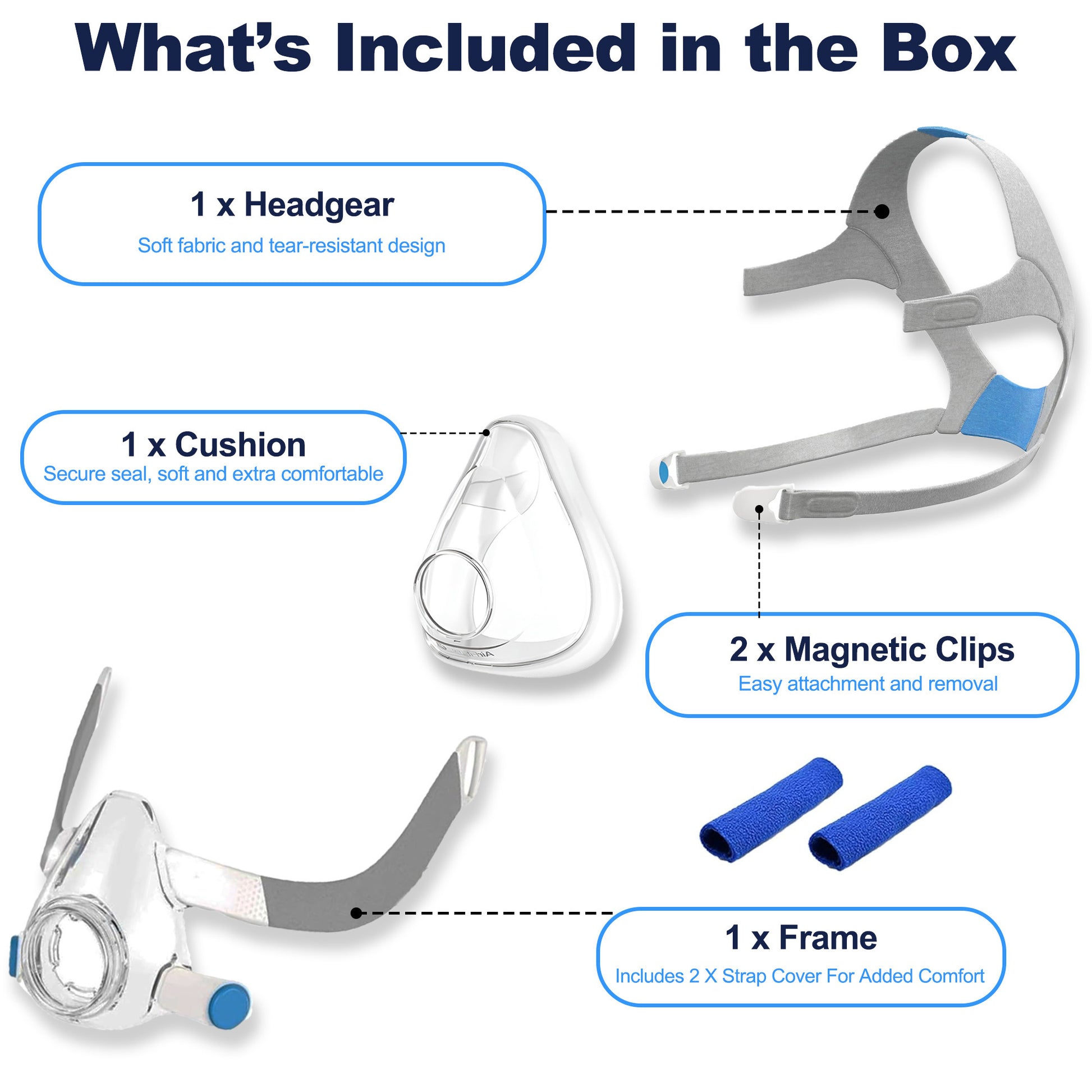 - COMPLETE KIT – Includes cushion, headgear, frame, two strap covers, and clips. (Elbow connector not included.)